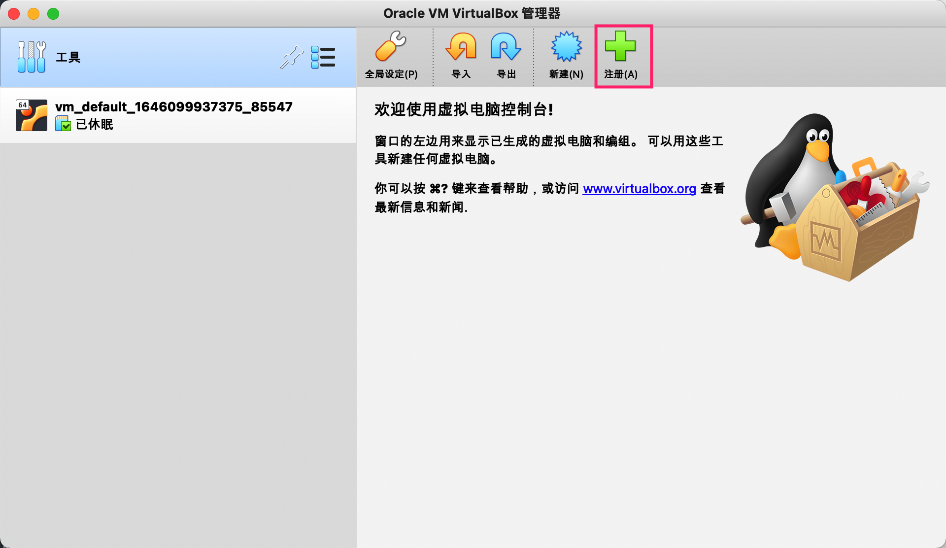 然后通过 U 盘或移动硬盘将复制的虚拟机拷贝到另外两台电脑上,打开 VirtualBox,点击注册,选择复制的虚拟机文件。
