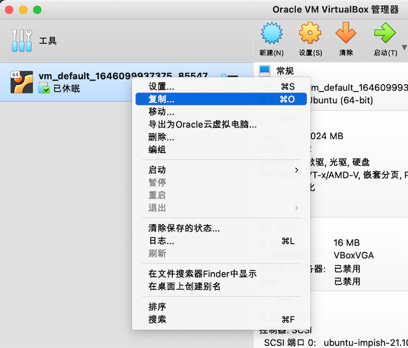 在 VitrualBox 界面将虚拟机关机后,右键复制,选择保存的路径,需要注意: