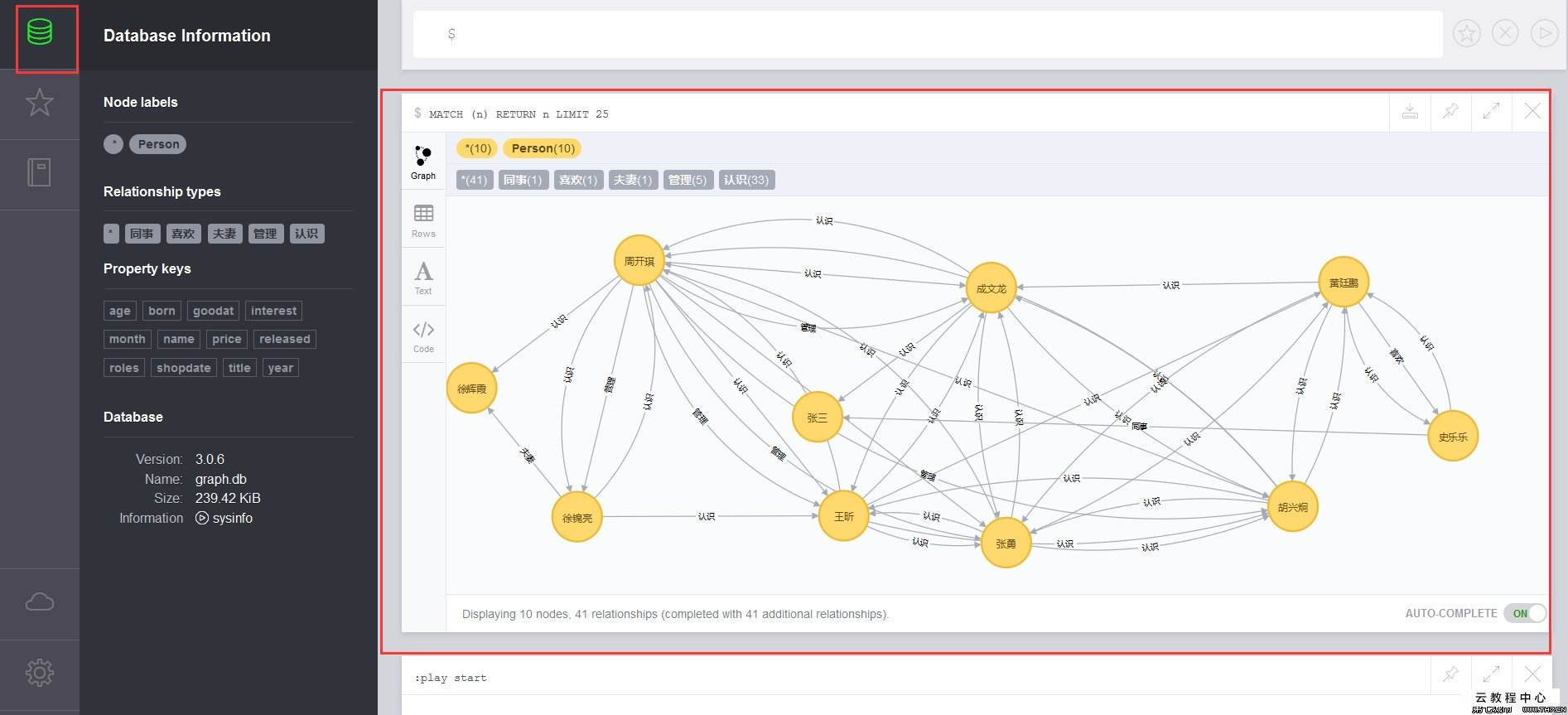 Neo4j Browser提供图形化界面来与图数据库进行交互。用户可以通过它执行cypher语句并得到图形化的查询结果。在Neo4j Browser中,可以看到当前数据库中的节点数目和关系数目、节点和关系的种类、属性键名、存储空间占用情况等。此外,它还提供了一些新手教程、样例数据等。